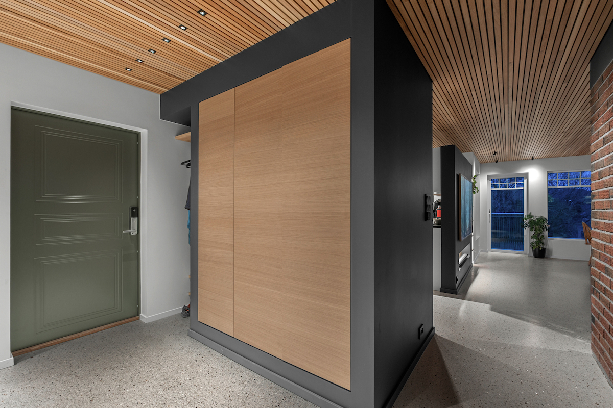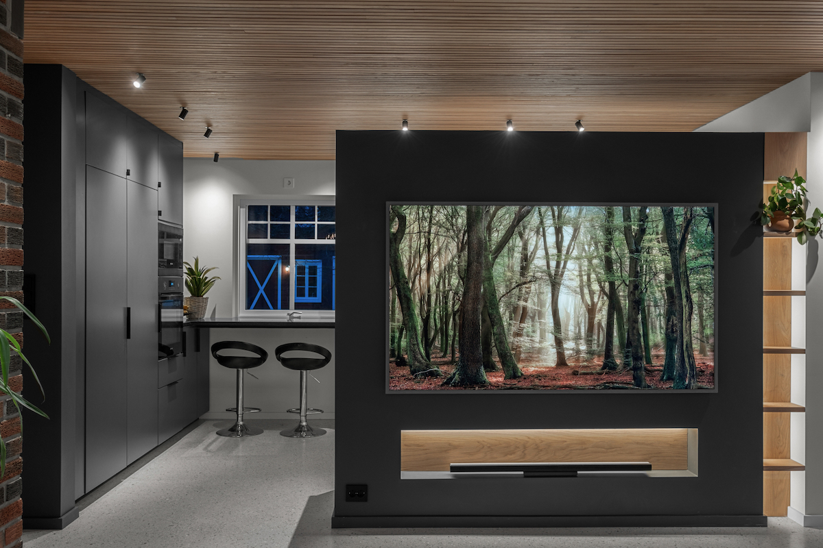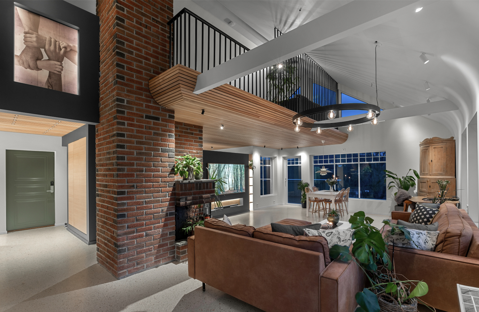 Allerede når du kommer over dørstokken, legger du merke til materialene som er valgt. På gulvet ligger terrazzobasert epoxy side om side med brede eikegulv fra Danmark. Taket på stua og kjøkkenet er eikespiler av beste kvalitet. Lyssettingen tenker du først over når du blir gjort oppmerksom på den.